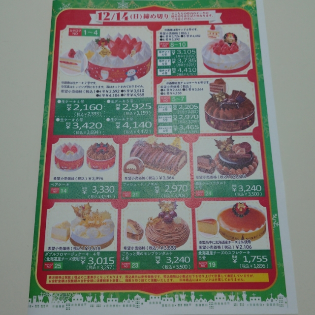 ※一部のケーキは予約締切日は12月10日(水)までです。予約用紙に12月10日までのケーキ類は早期〆切のマークが記載してあります。