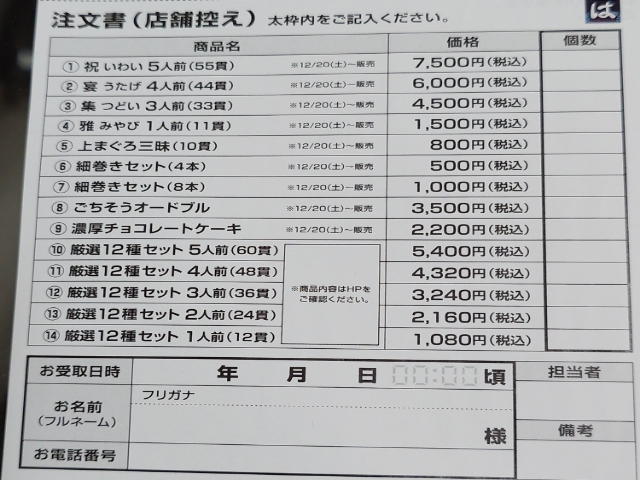 上記の画像は予約用紙の注文書(店舗控え)
