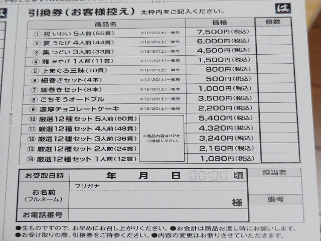 用紙は商品名・価格が記載されているので、個数受け取り日時名前電話番号を必ず記入して下さい。